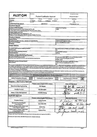 2008年我公司為ALSTOM提供的葉片通過了FPR(完全放行文件)、并且成為國內(nèi)唯一一家ALSTOM授予FPR的產(chǎn)品供應(yīng)商。