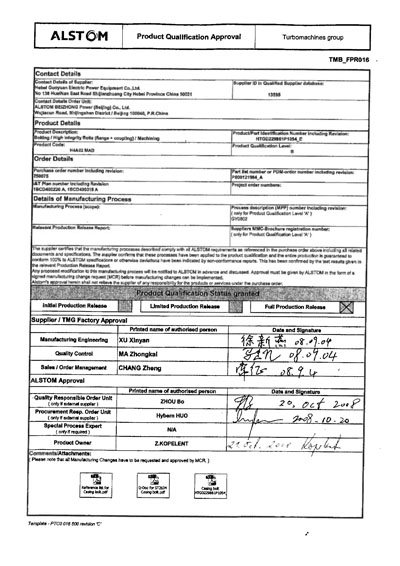 2008年我公司為ALSTOM提供的汽缸螺栓通過了FPR(完全放行文件)、并且成為國內(nèi)唯一一家ALSTOM授予