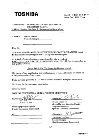 經(jīng)過日本東芝公司TOSHIBA對我公司的三次考察,順利通過認證,特頒發(fā)合格供應商資質(zhì)證書。